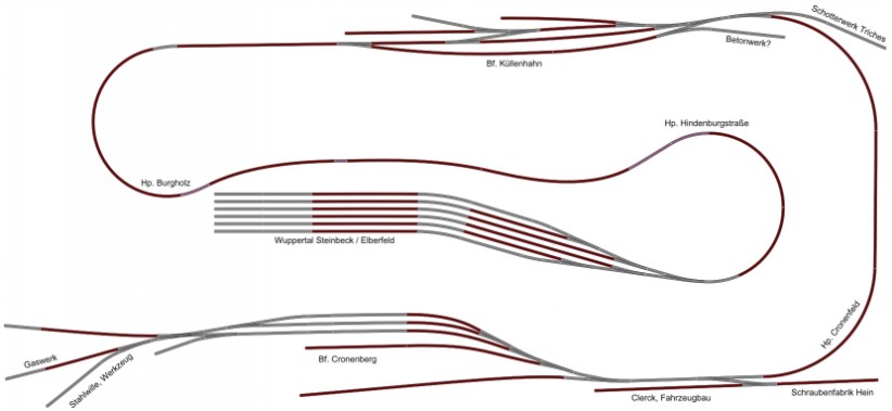 Kenner der Strecke werden bemerken, dass ich den Bahnhof Cronenberg spiegelbildlich angelegt habe und der Gleisanschluss Triches auf der falschen Seite liegt. So passt es aber einfach besser.