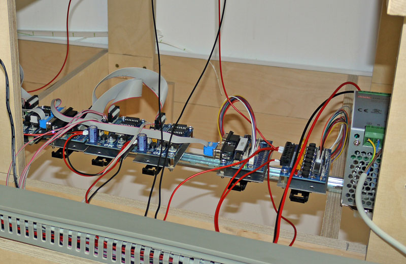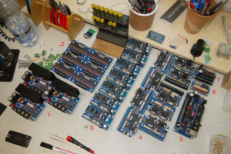 Auf dem folgenden Foto sind die auf der Anlage verwendeten Elektronik-Module zu sehen. Das war der erste Schub, den ich gebaut habe, später sind von der Anzahl her weitere dazugekommen.