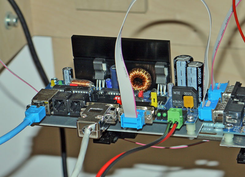 Die Verkabelung des LocoNets erfolgt weitgehen mit neunpoligem Flachbandkabel auf das neunpolige Sub-D Steckverbinder aufgepresst sind. Alle Elektronik-Bausteine der Anlagensteuerung habeich auf Aluminium-Platten Montiert, die an der Unterseite Adapter für Hutschienen nach EN 50022 tragen. Damit kann ich einzelne Bausteine jederzeit ohne Schrauberei aus der Anlage nehmen, prüfen, reparieren und wieder einsetzen. Weil ich alle Bausteine am Anlagenrand montiere, brauche ich auch nicht unter der Anlage herumzukriechen, wenn eine Reparatur erforderlich ist - man ist ja nicht mehr der Jüngste.
